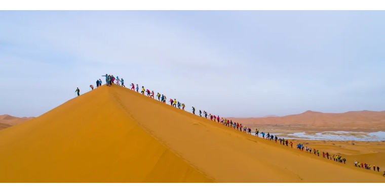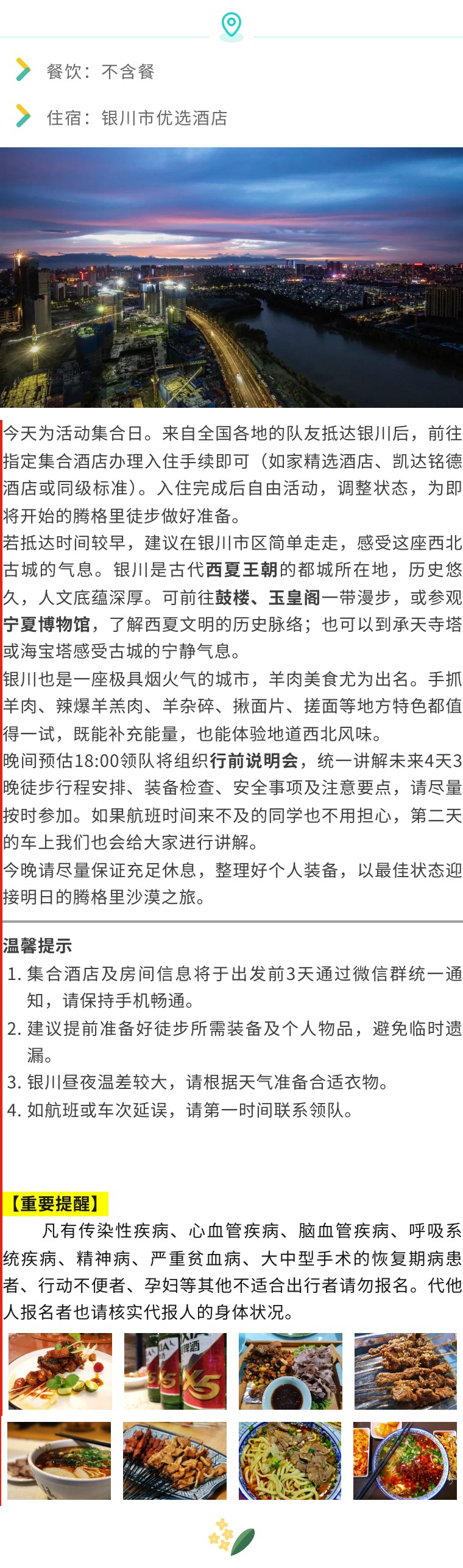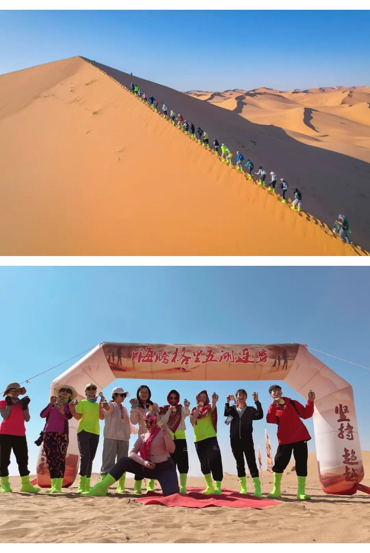 今日沿途可远眺月亮湖(不进入湖内),碧绿湖水、漫漫黄沙、蔚蓝天空在这里交织成一个美妙的画卷,继续行走10公里到达终点! 领队在终点为大家颁发奖牌,集沙瓶,合影留念;午餐过后,大家一起返回银川解散。