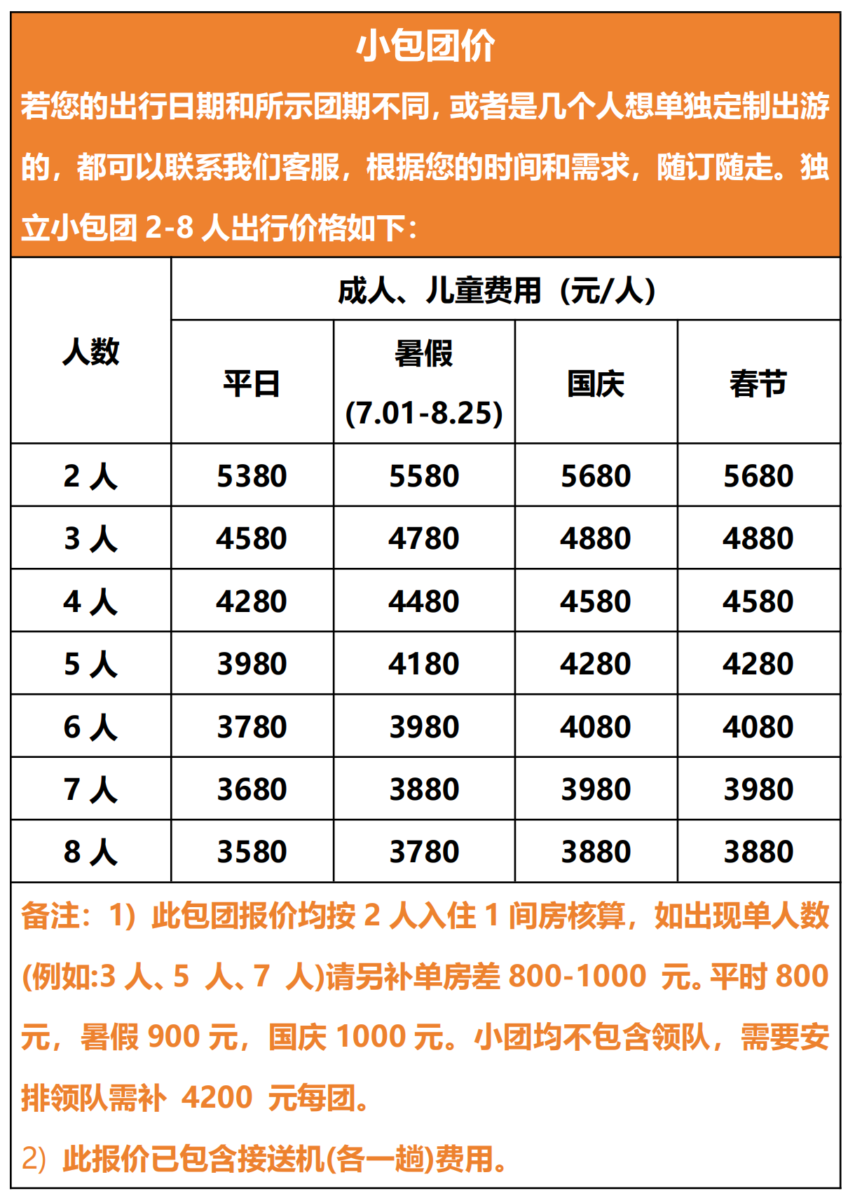 【活动费用】:平时成人3480元/人,儿童:1600元/人;暑假旺季3680元/人,儿童:1800元/人;国庆节/春节成人3880元/人,儿童:1900元/人;儿童价格(不占床位和门票,如若产生门票费用则自理);