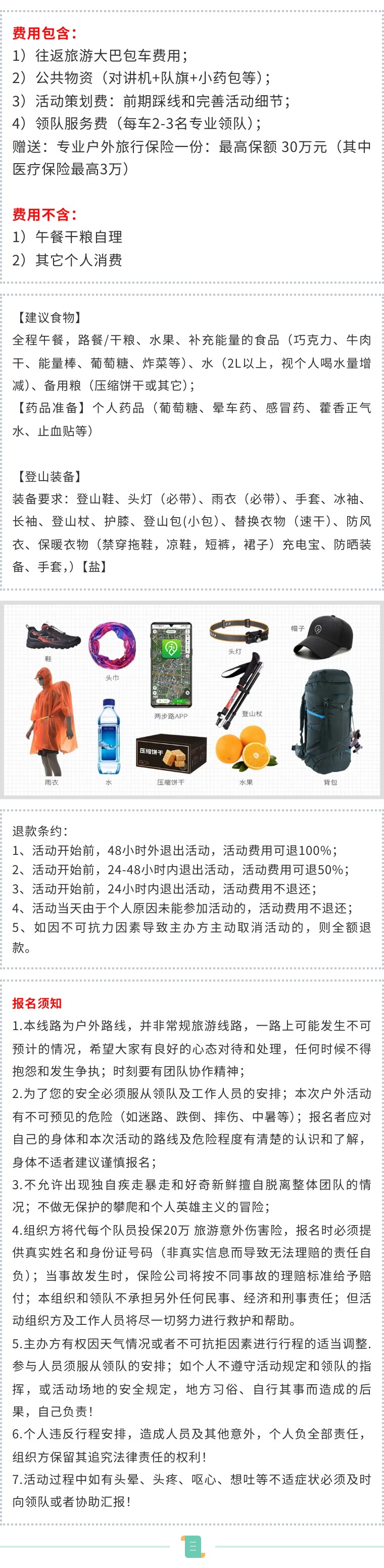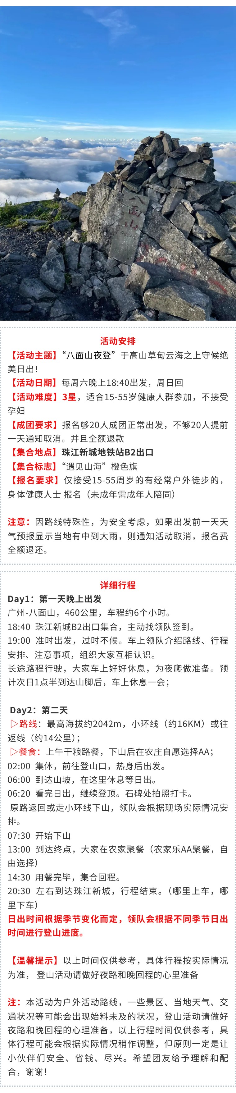 重要提醒:如万一如碰到堵车或其它交通管制导致凌晨2:00到不了登山口。即需要凌晨5:00以后继续前往登山口进行登山(会错过山顶日出)不接受任何因堵车原因的投诉,介意请勿报名,谢谢!