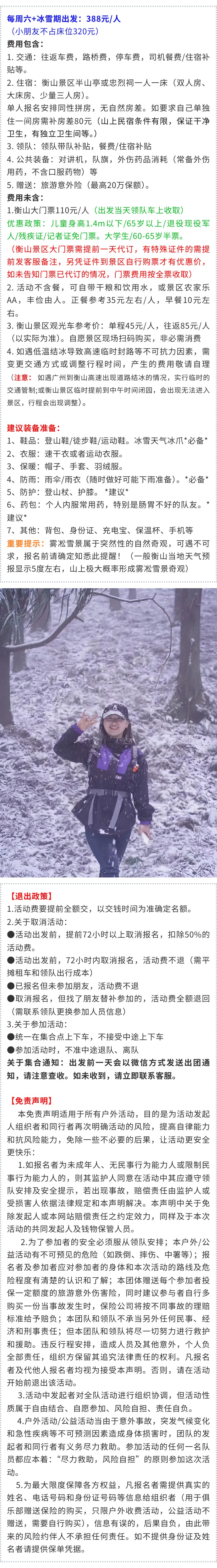 重要提示:雾凇雪景属于突然性的自然奇观,可遇不可求,报名前请确定知悉此提醒!(一般衡山当地天气预报显示5度左右,山上极大概率形成雾凇雪景奇观)