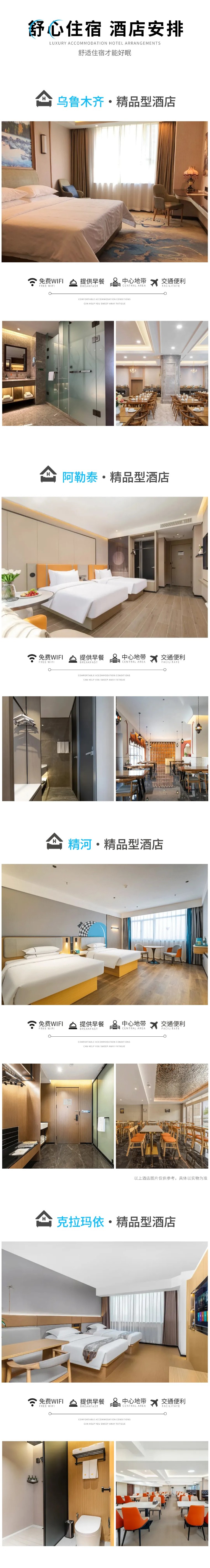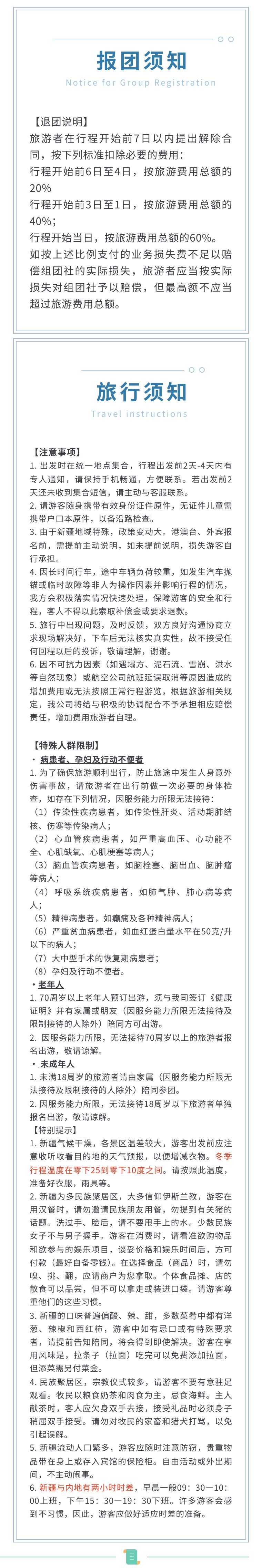 *以上行程仅供参考,由于新疆地域宽广,不确定因素较多,领队有权根据实际情况,在不减少浏览景点的情况下对行程进行调整,敬请以出团通知和最终安排为准。