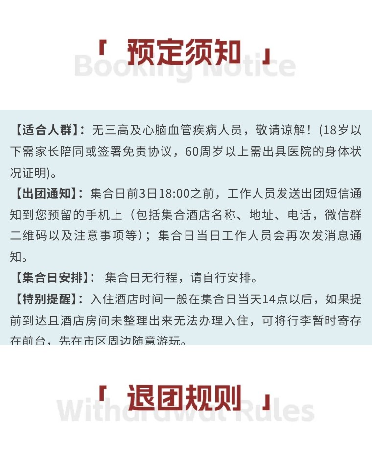 特别说明:根据季节、天气、交通、景区限流等情况,我司在不减少景点的前提下有权调整景点游览的先后顺序,以保证各位贵宾行程完整!请报名前仔细阅读并知悉!