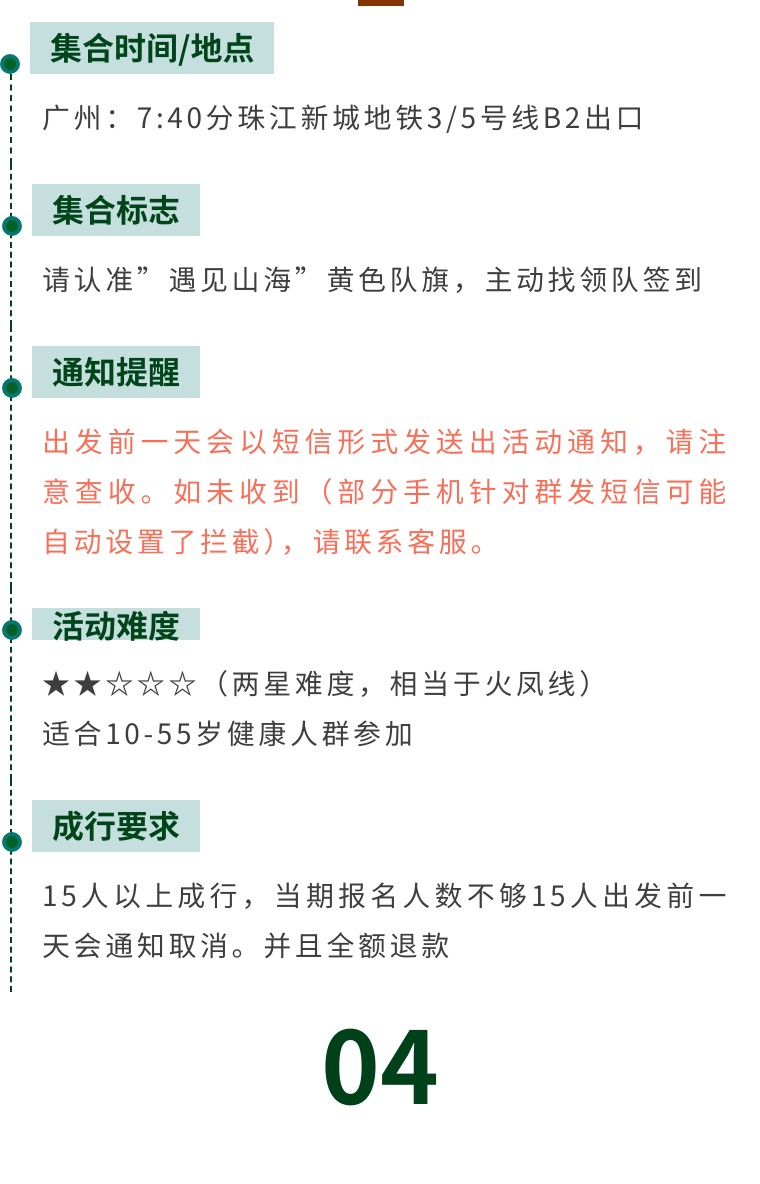 07:40 珠江新城地铁站B2出口集合,主动找领队签到。(如节假日,出发时间会略提前,具体以通知短信为准)