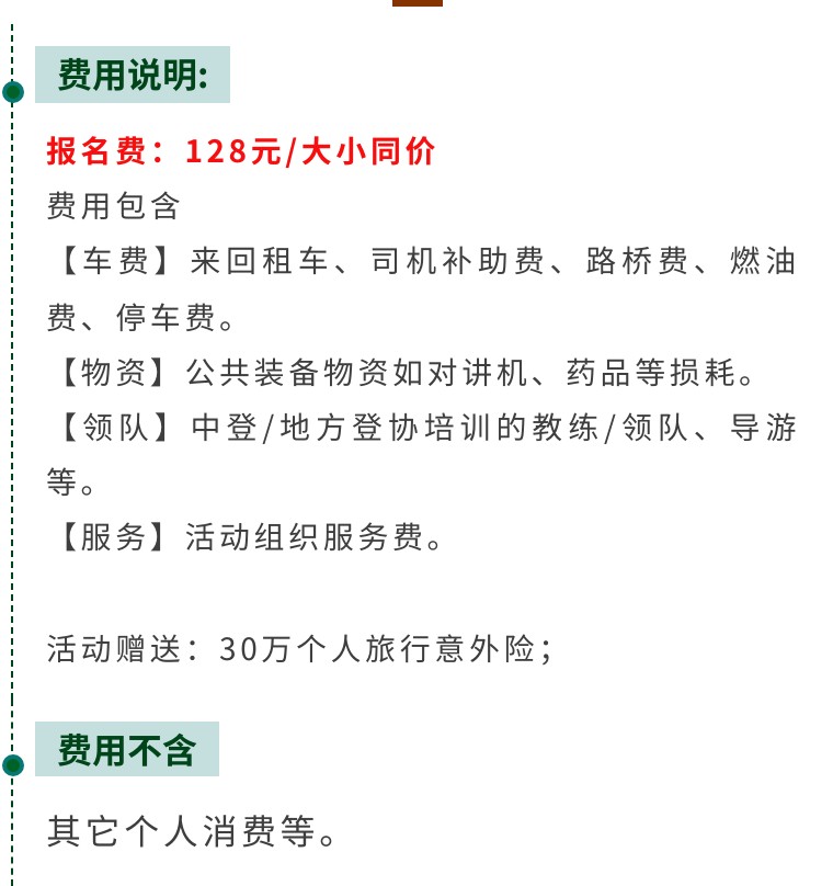 特别说明:如果遇到大雨/堵车(节假日高速车流量比较大)/封路等突发原因,领队根据现场情况对行程进行调整,一切以安全、顺利为原则,报名请知悉,谢谢理解和配合,报名即默认接受我们的安排,届时不接受由此引起的投诉和相关费用退还。