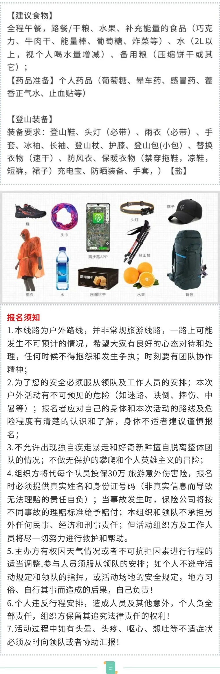以上行程安排仅供参考,户外环境情况多变不稳定,因突发因素(包括但不限于因队员体力不支,抽筋,扭到脚,受伤,堵车等情况)和不可抗力因素导致不能按原定路线进行或者耽误回程时间的,领队有权根据实际情况调整,而且不接受因此投诉和退款的要求,报名即为接受安排。
