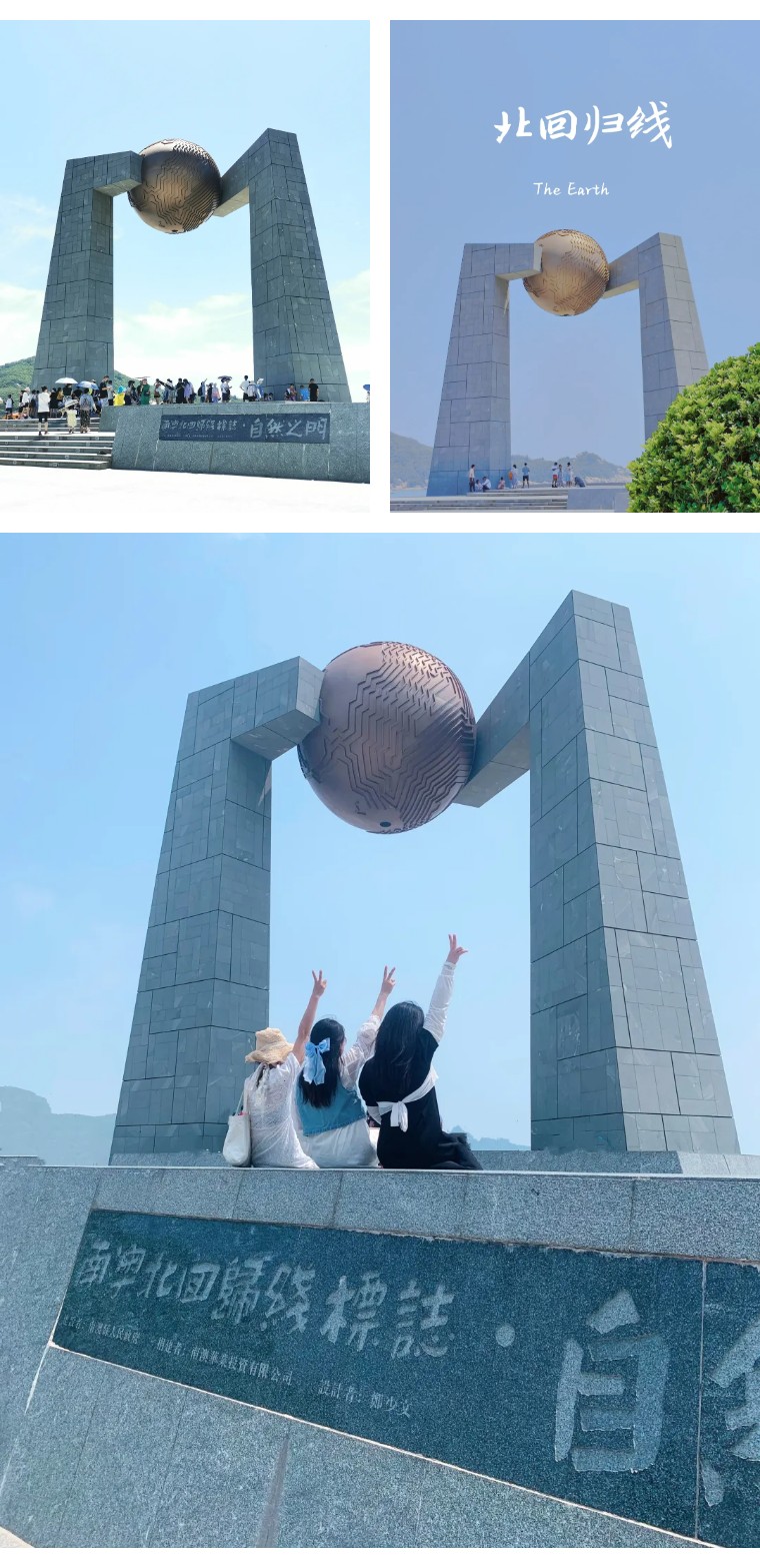 “自然之门”是我国已有的11座北回归线标志塔之一,也是唯一一座位于海岛上的北回归线标志塔。塔身由汉字“门”字演变而来。每年夏至正午,太阳直射北回归线,日影将穿过上方圆球中心圆管,投射地台中央,达到“立杆不见影”的效果。