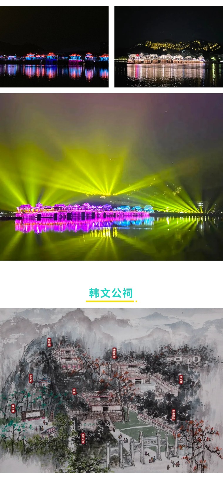 潮州古城灯光秀,韩山映射水波纹、波光粼粼,自然光色与古城风韵结合。诗的意境、画的取景,一江两岸即在画中,又在诗中,俨然有一股水墨乡愁丹青韵味。古城灯光秀是与气势磅礴的潮州音乐紧密结合,绝佳视觉、听觉享受!