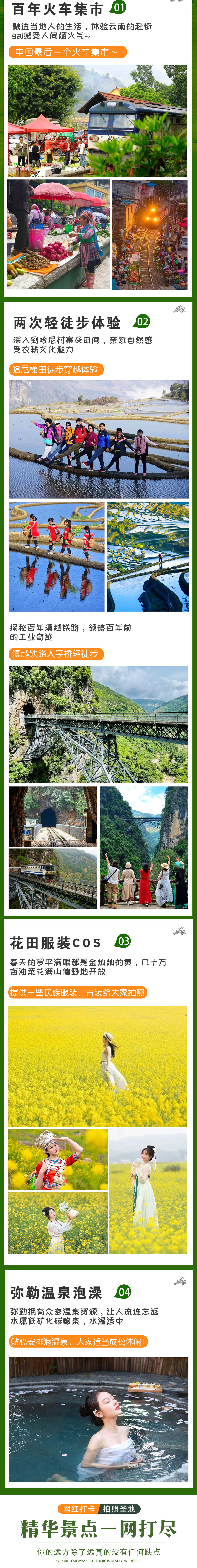 【独家深入】:摒弃走马观花,贴心安排2次旅行轻徒步体验。1)独家安排哈尼梯田徒步穿越体验,带您深入到哈尼家庭及田间,亲近自然感受农耕文化魅力;2)独家安排滇越铁路人字桥轻徒步,零距离感受百年滇越铁路的斑驳历史与印记。