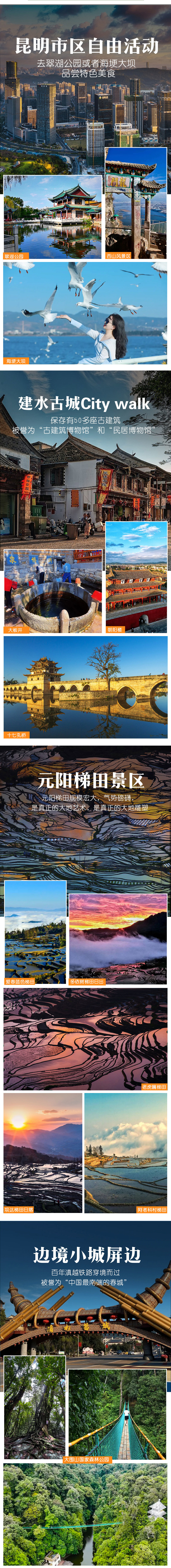【适合人群】: 本线行程安排景点丰富,且比较紧凑舒适。适合休闲游、深度游、行摄游等各类人群,在慢节奏中感受七彩云南绮丽风光。