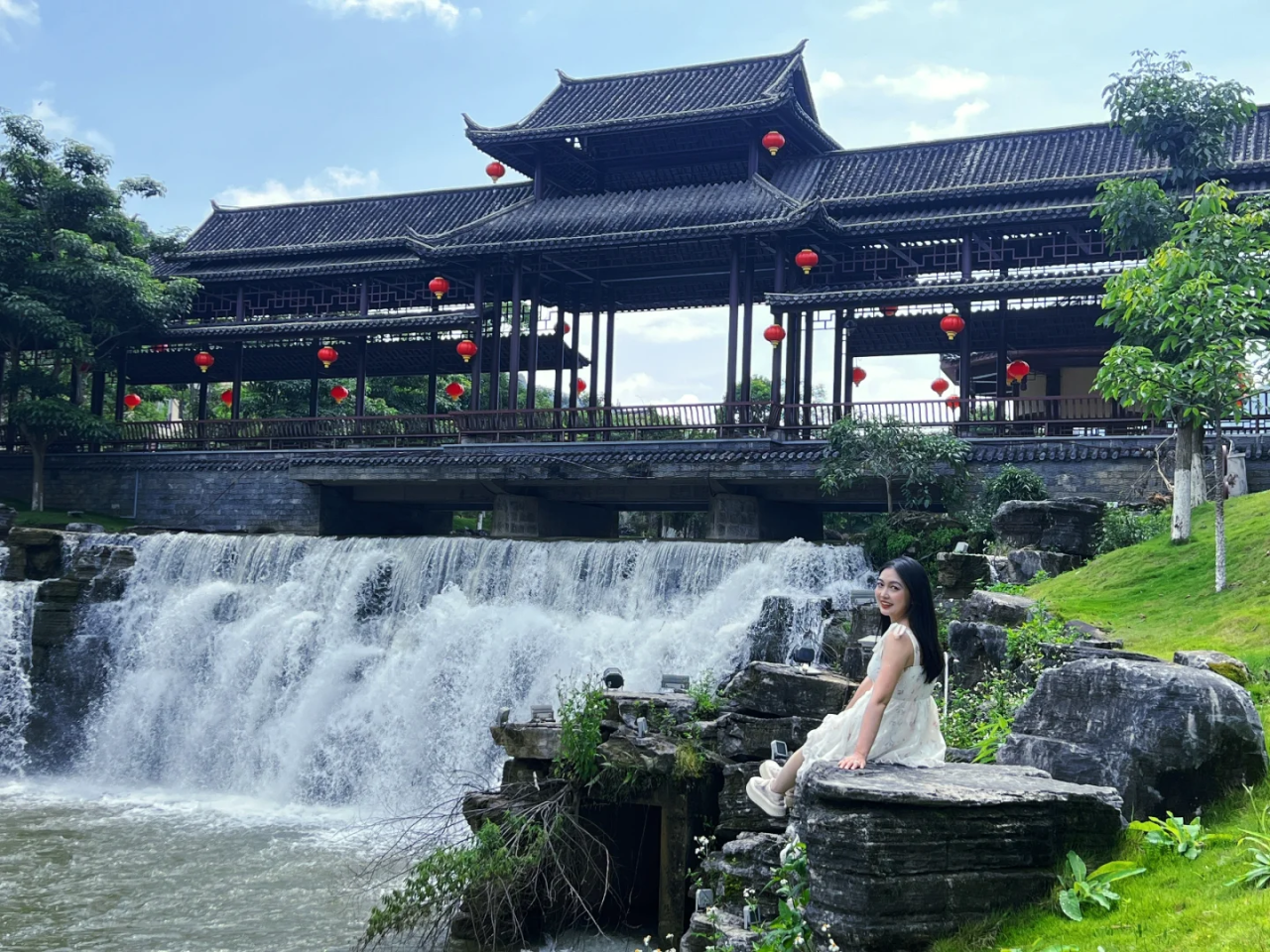 我们返程到【滴水苗城】,独特且统一的苗式建筑,让人一进入牛角寨门后就从视觉上体验到当地的苗族文化,这里山水相依,四季常青,水坝形成瀑布景观,是拍照打卡的绝佳地点。