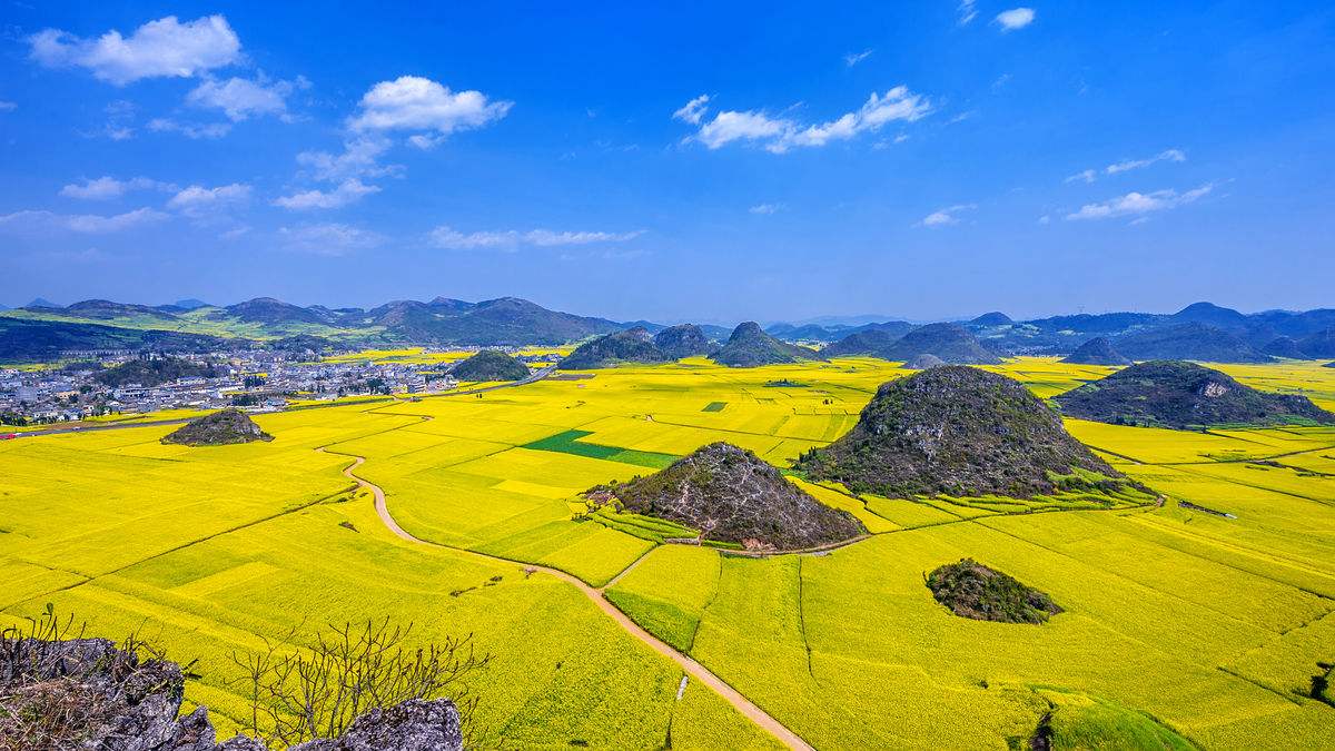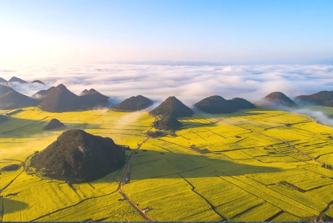 玩后前往罗平【金鸡峰从】,此处地方比较灵活,大家可以分开游玩,金鸡峰可以在附近山头拍照,也可租电瓶车或自行车前往更深入的地方看花海。春天的罗平满眼都是金灿灿的黄,几十万亩油菜花满山遍野地开放,非常充裕的时间留给您尽情拍照,还特意为您准备了特色民族服装让您尽情地放飞自我凹造型!天气好可以拍摄到耶稣光射到云雾中若隐若现的油菜花以及金鸡峰群。日落后我们前往罗平县城入住。