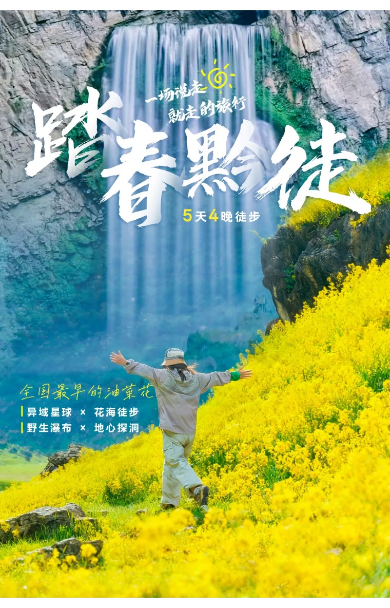 全程轻徒步包含2段野线+1段探洞+1段骑行,整体线路坡度平缓,路况安全;骑行穿越油菜花海,线路涵盖喀斯特石林、油菜花海、地下溶洞、山野瀑布,沐浴在云贵高原的暖阳之下,沉浸式感受这条春日限定的徒步路线。