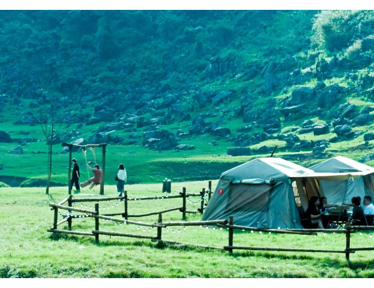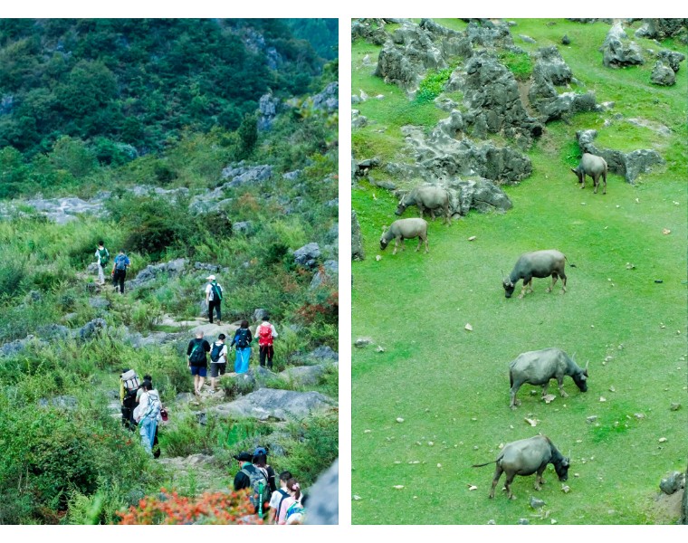 铜鼓荡之所以被称为“铜鼓”,是因为这里自带大自然的天籁之声。它们是乱石穿空、暗河嘶吼和惊涛拍岸共同组成若铜鼓般的声响,春天更是一大片石林嵌在绿油油的草地上,徒步会遇见山谷内宽阔弯曲的湿地、草坪、成群的牛马、石林、崖壁和穿洞自然形成的独特景观。