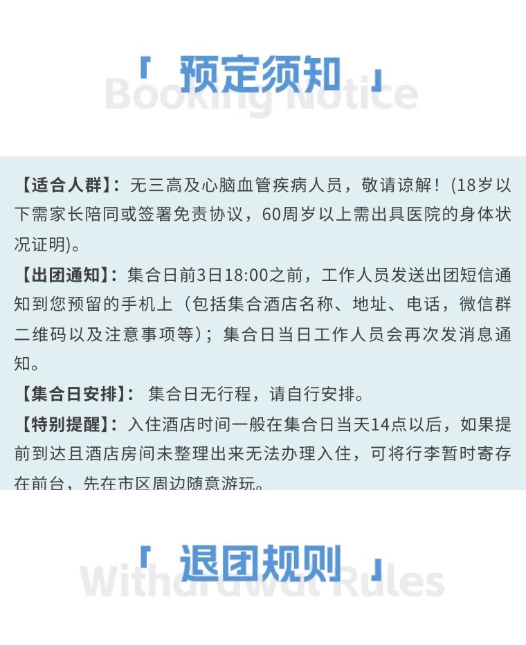 特别说明:根据季节、天气、交通、景区限流等情况,我司在不减少景点的前提下有权调整景点游览的先后顺序,以保证各位贵宾行程完整!请报名前仔细阅读并知悉!