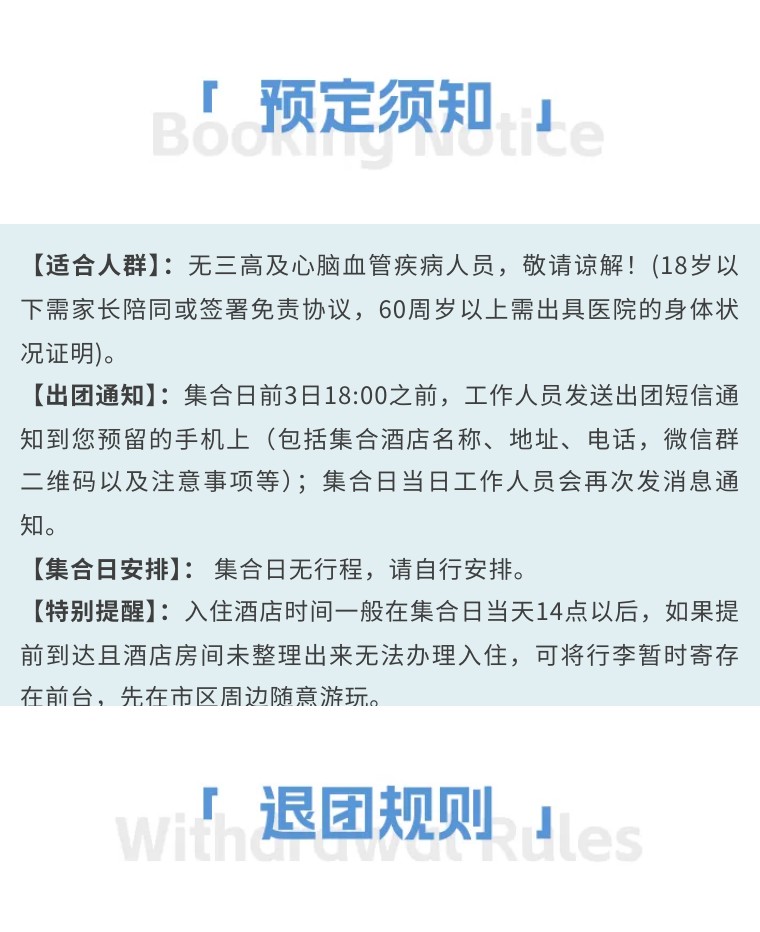 特别说明:根据季节、天气、交通、景区限流等情况,我司在不减少景点的前提下有权调整景点游览的先后顺序,以保证各位贵宾行程完整!请报名前仔细阅读并知悉!