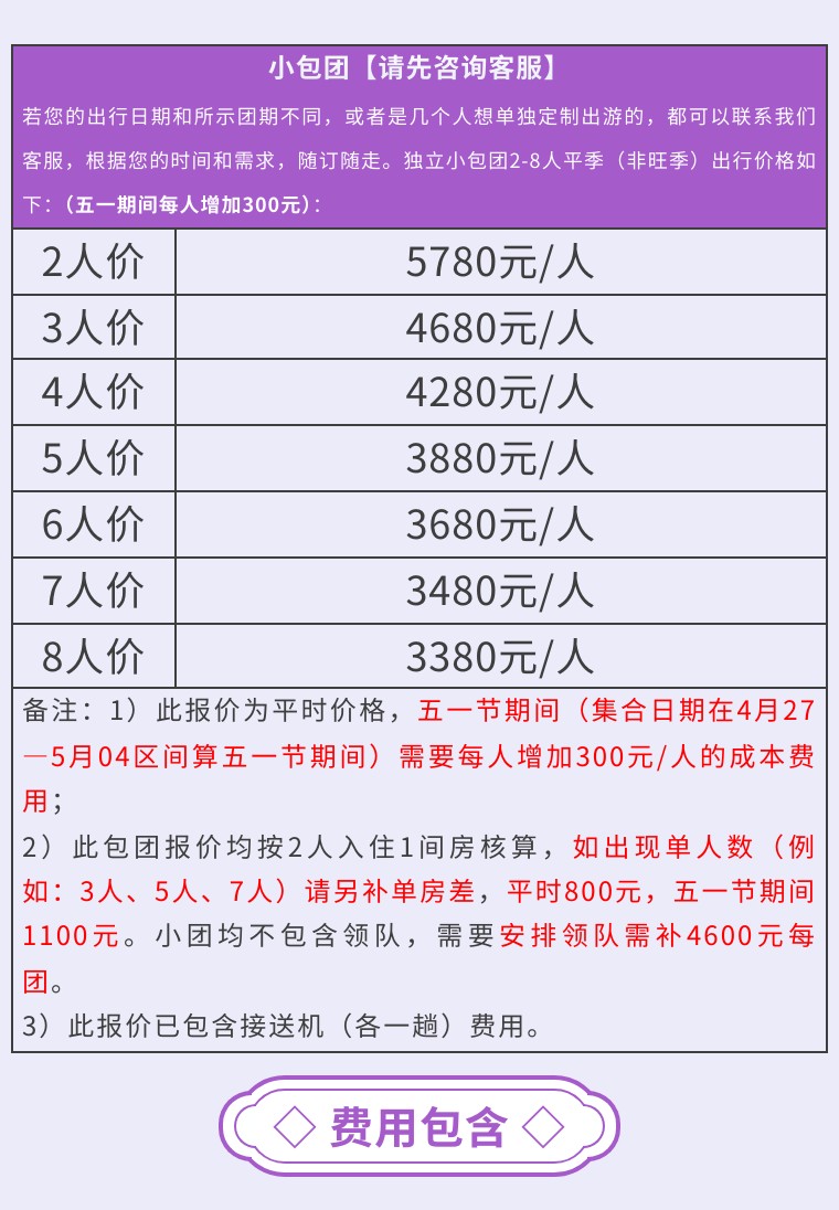 5.【单人房差】平常800元/人,第3期1000元/人,五一节1100元/人(行程住宿按照双人标准间安排,单人报名拼房不成,单房差由我司承担,如队员个人要求单住则需补齐房差!)