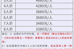 第4-5期 五一成人:3680元/人 儿童:1800元/人 单人保证拼房 ,(儿童不占床位不含门票)