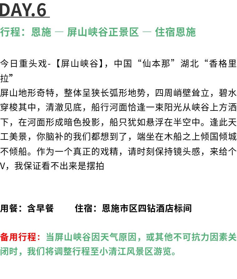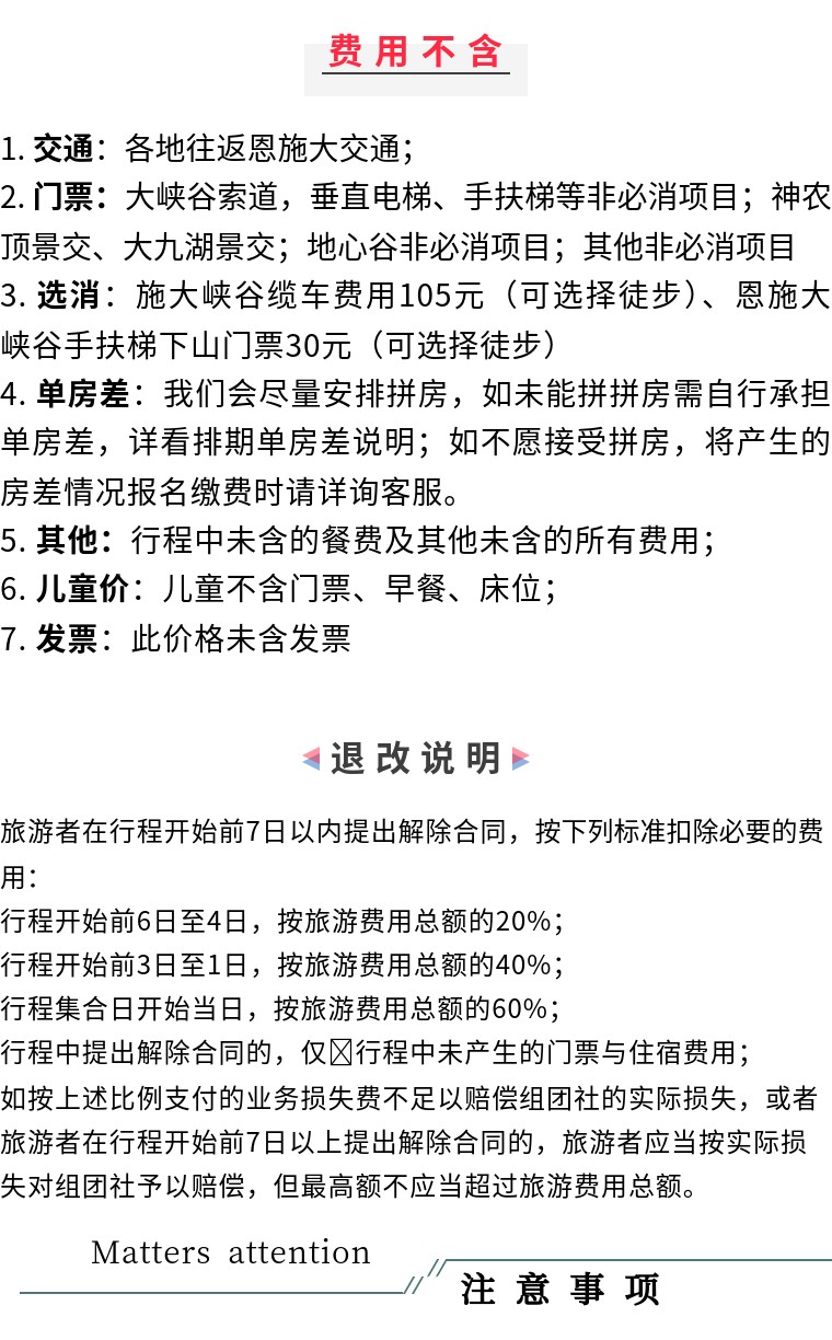 3. 门票:神农架景区门票、屏山峡谷门票+船票+换乘车、恩施大峡谷门票+景交+地面缆车、梭布垭石林门票+景交、神农溪门票、地心谷门票