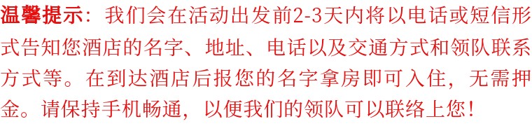 3. 本线路并非常规旅游线路,一路上可能发生不可预计的情况较多,希望大家有良好的心态对待和处理,任何时候不得抱怨和发生争执;时刻要有团队协作精神;