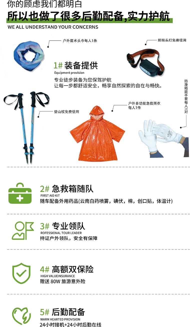 3.活动提供装备中说明的:头灯/登山杖各一件免费租借(用后回收,如需要双杖请提前告知),赠送头巾/手套、户外多功能急救雨衣(不回收)