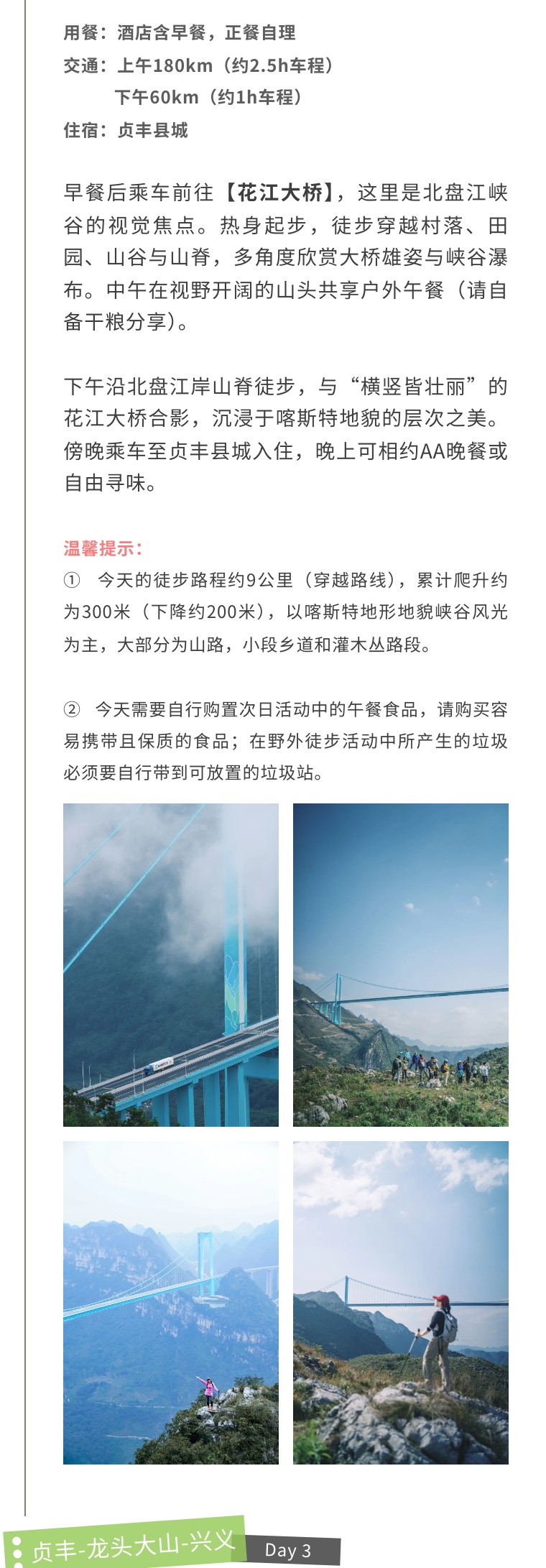 2.本活动因涉及户外徒步、长途坐车、刺激项目等情况,报名人需确保身体健康适宜旅游,有高血压、心脑血管疾病、传染性疾病、呼吸系统疾病、精神病、严重贫血病、大中型手术的恢复期病患者、行动不便者、孕妇等情况游客谢绝参加。代他人报名者,须准确了解被报名人的健康情况是否满足本线路要求。