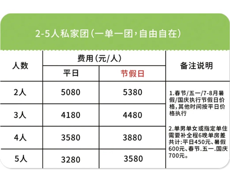 ➂ 单房差:单人报名默认同性拼房(拼房不成功无需另付单房差);指定单住或1成人带1儿童(需补全程6晚单房差价共计:平日450元/人,暑假600元/人,春节、五一、国庆700元),2人一起报名默认住1间房(如需分开住请主动说明)