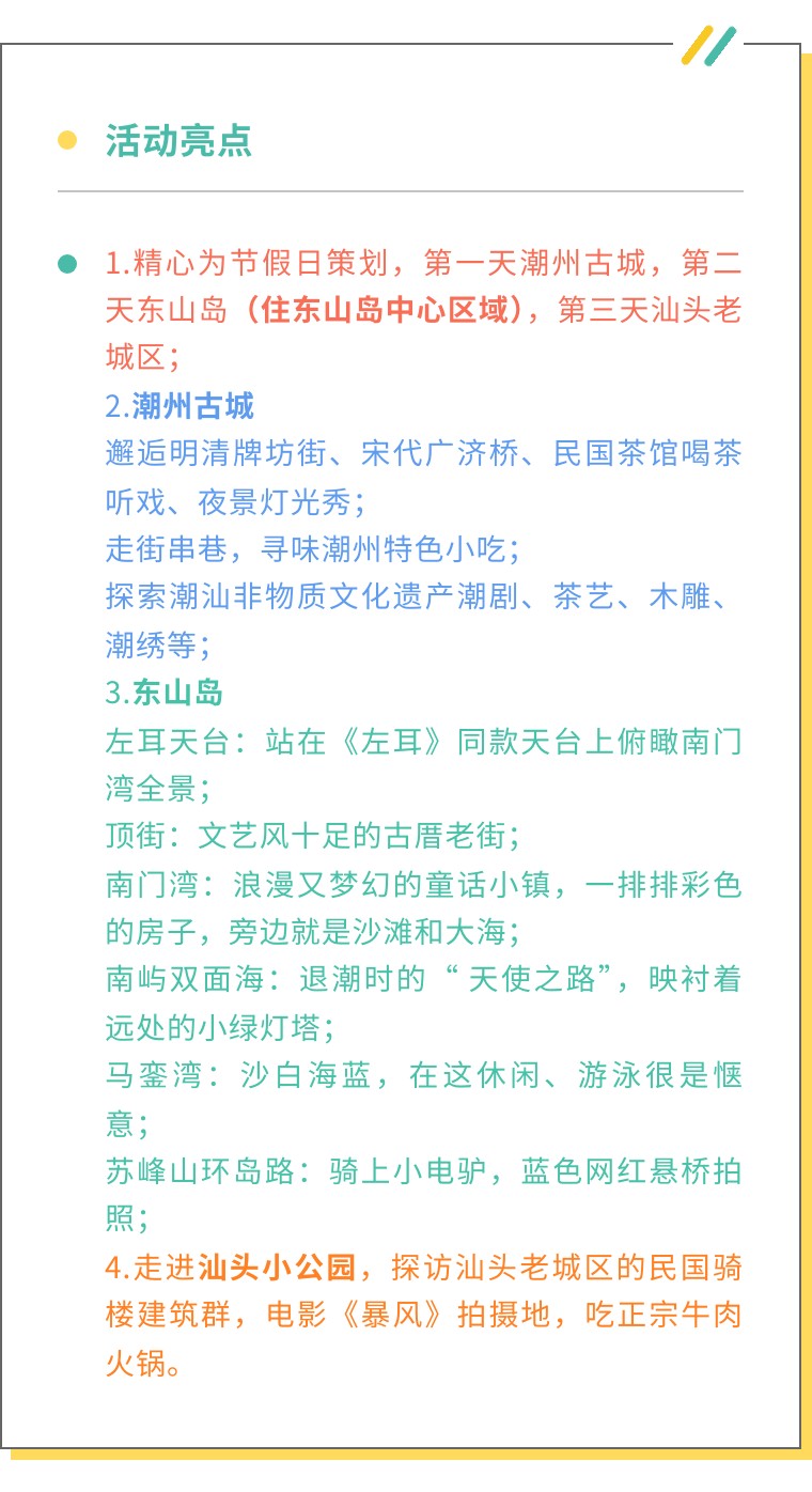 ②住宿:1晚潮州/汕头或周边商务酒店,1晚东山岛海边度假公寓或海边镇上的酒店(2人一间房。单人报名默认安排同性拼房,如需单独住,需补房差)