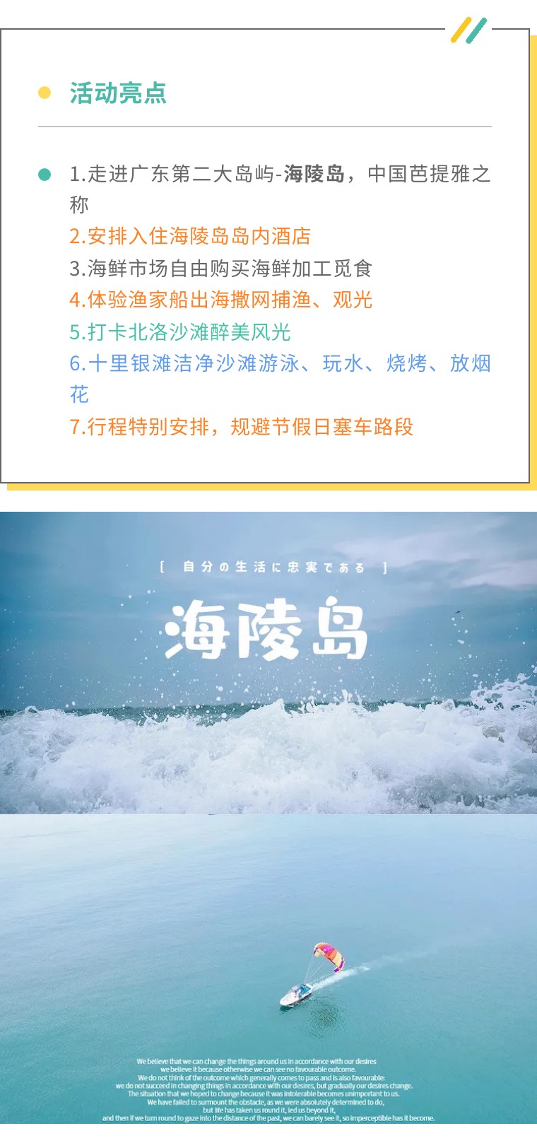07:40-08:00 广州杨箕地铁站E1出口签到上车出发 ,08:30途经龙溪地铁站C出口上车(报名时请备注),然后出发前往中国最美的十大海岛之一海陵岛。