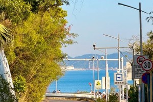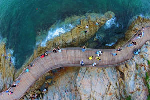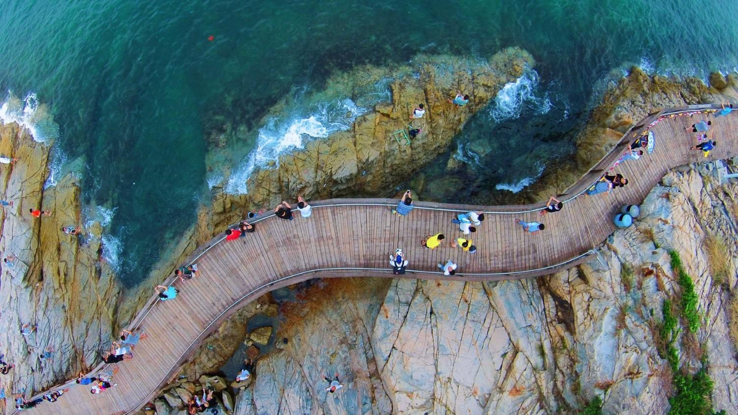 走在栈桥上,一望无际的海面波澜壮阔。栈道弯弯曲曲,蓝天白云,海蓝浪花,构成一幅美丽的景色。栈道漫步、骑行,面向大海,听惊涛拍岸,栈道旁边绿树成荫,海风拂面。