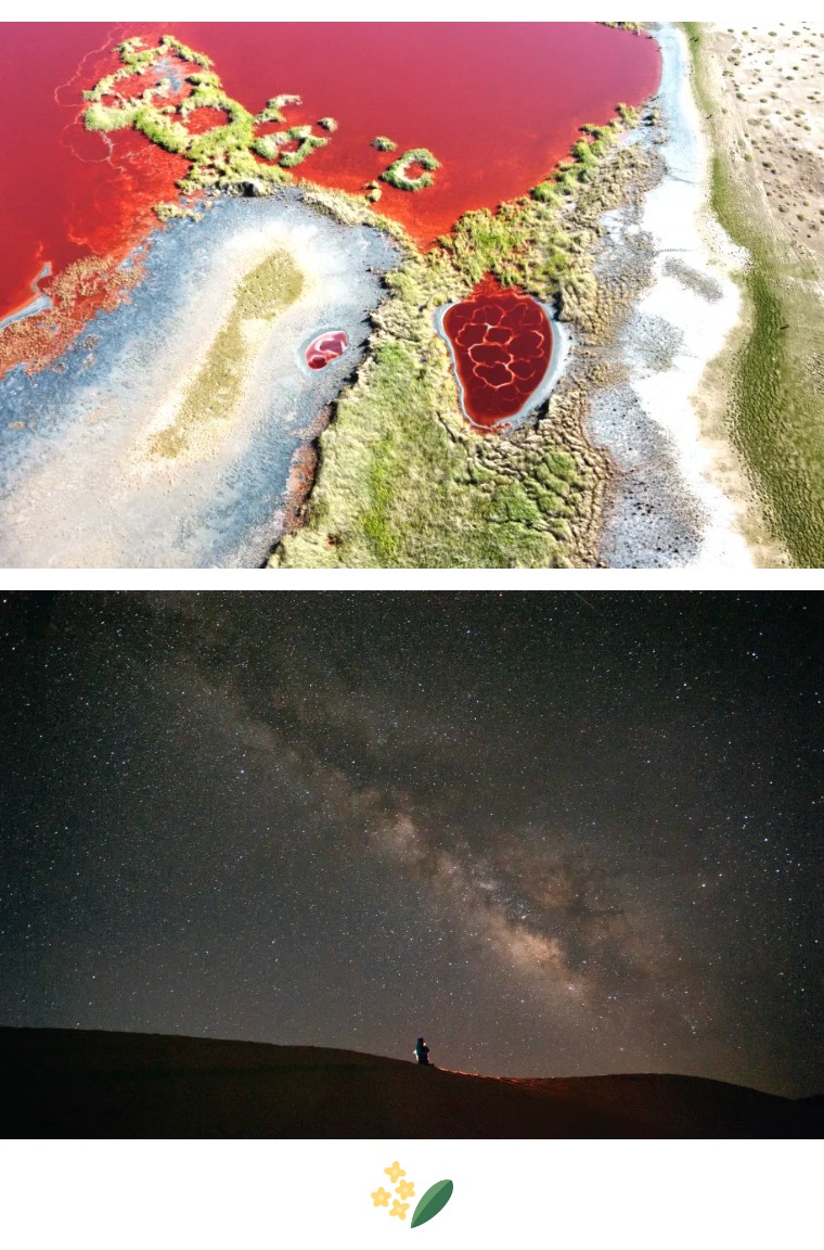 乌兰湖,是藏在腾格里沙漠腹地的红色心脏,以极致的色彩和形态震撼人心,被金黄沙丘、银白盐滩、浅绿芦苇环绕,对比强烈。
