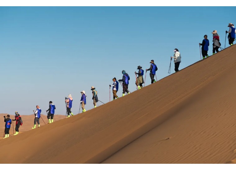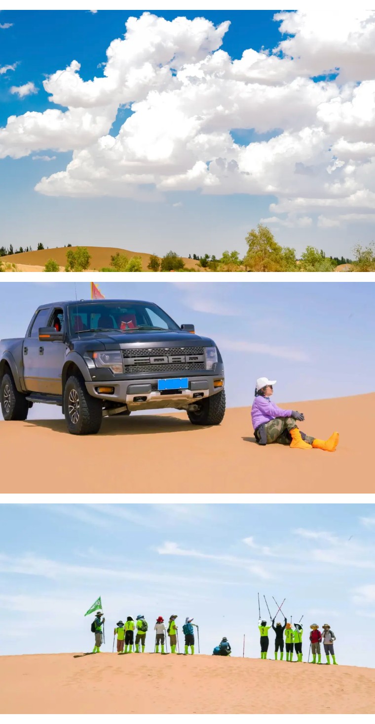 上午11:00左右我们抵达徒步起点,分发沙套、魔术头巾、登山杖等物资,之后跟随领队在沙漠徒步起点处开始做热身运动,今日徒步全天行程12公里,匀速6小时左右即可到达营地,夜宿乌兰湖营地。